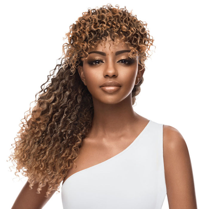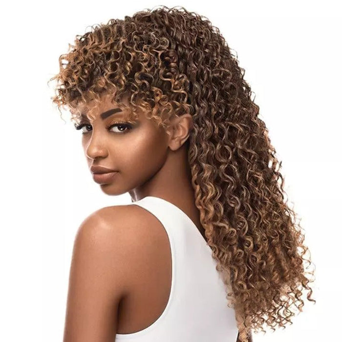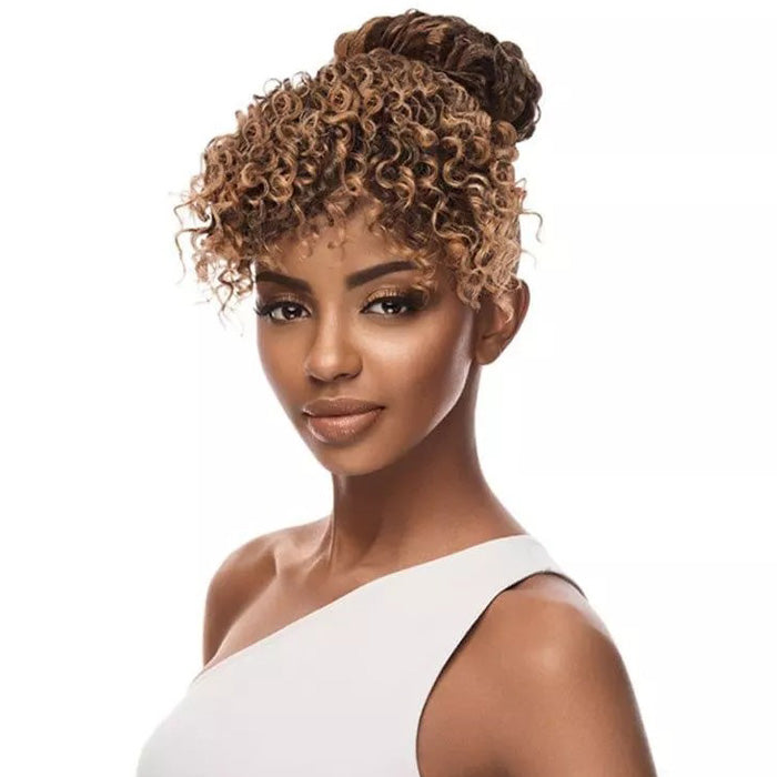 - Clip on bangs + drawstring construction