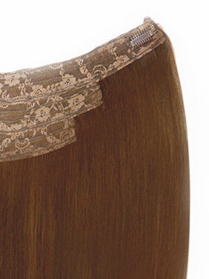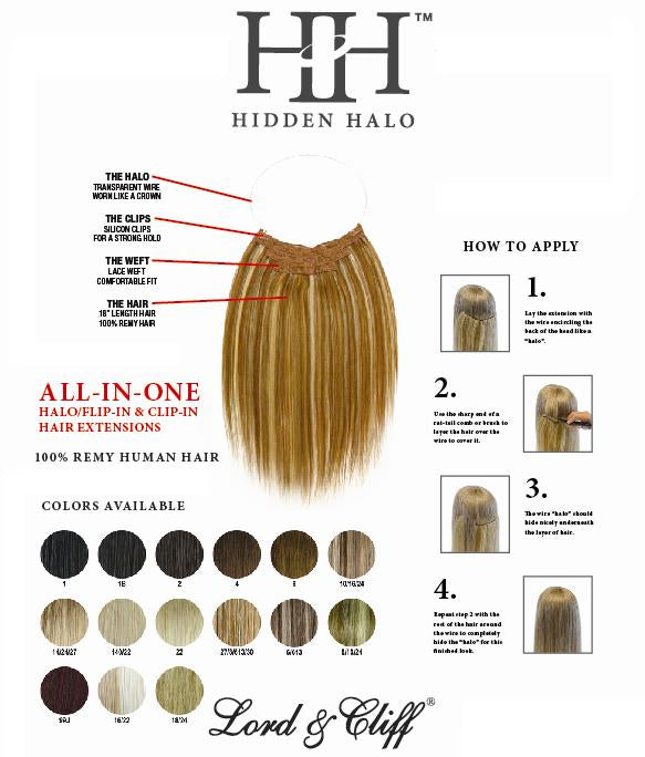 DESCRIPTION: The wire fits on top of the head like a "Halo" / Silicon clips for a more secure hold or use as a simple clip-in. The Lord & Cliff "Hidden Halo" is one of the newest styles of extensions. It is worn on a fish-line wire like a crown or a halo, then disguised when the natural hair is brushed over the extensions. That is how the "halo" becomes hidden. The "Hidden Halo" also includes clips for extra secure attachment and lace weft for comfort. This type of extension is also known as flip-in extensions. Available in 19 gorgeous colors.